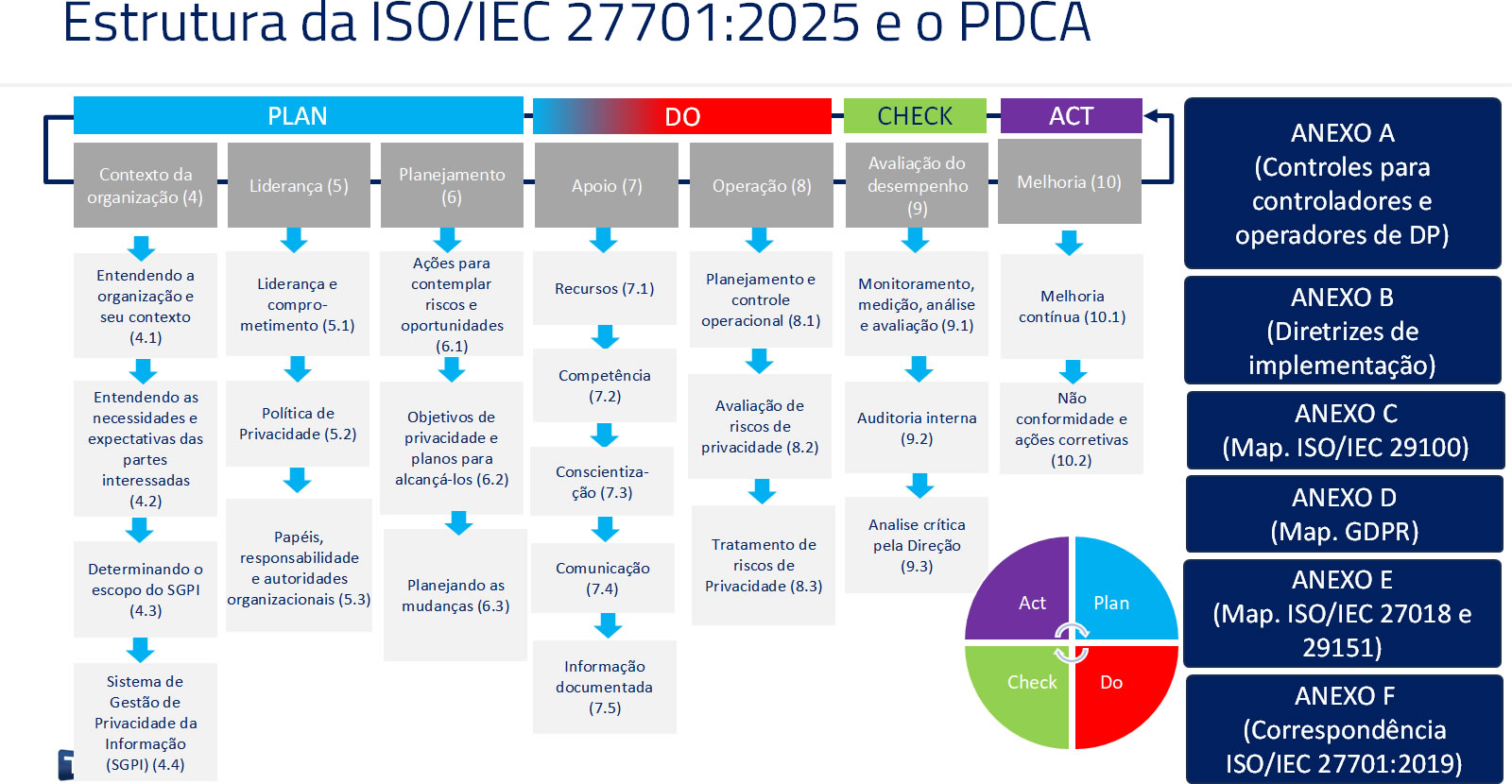 Isso significa que a ISO/IEC 27701:2025 segue o mesmo esqueleto de qualquer sistema de gestão moderno, com cláusulas de 4 a 10 estruturando o ciclo PDCA (Planejar–Executar–Verificar–Agir). Essa reorganização facilita a integração com outras normas como ISO 9001 (qualidade), ISO 22301 (continuidade de negócios) e ISO/IEC 42001 (gestão de IA).