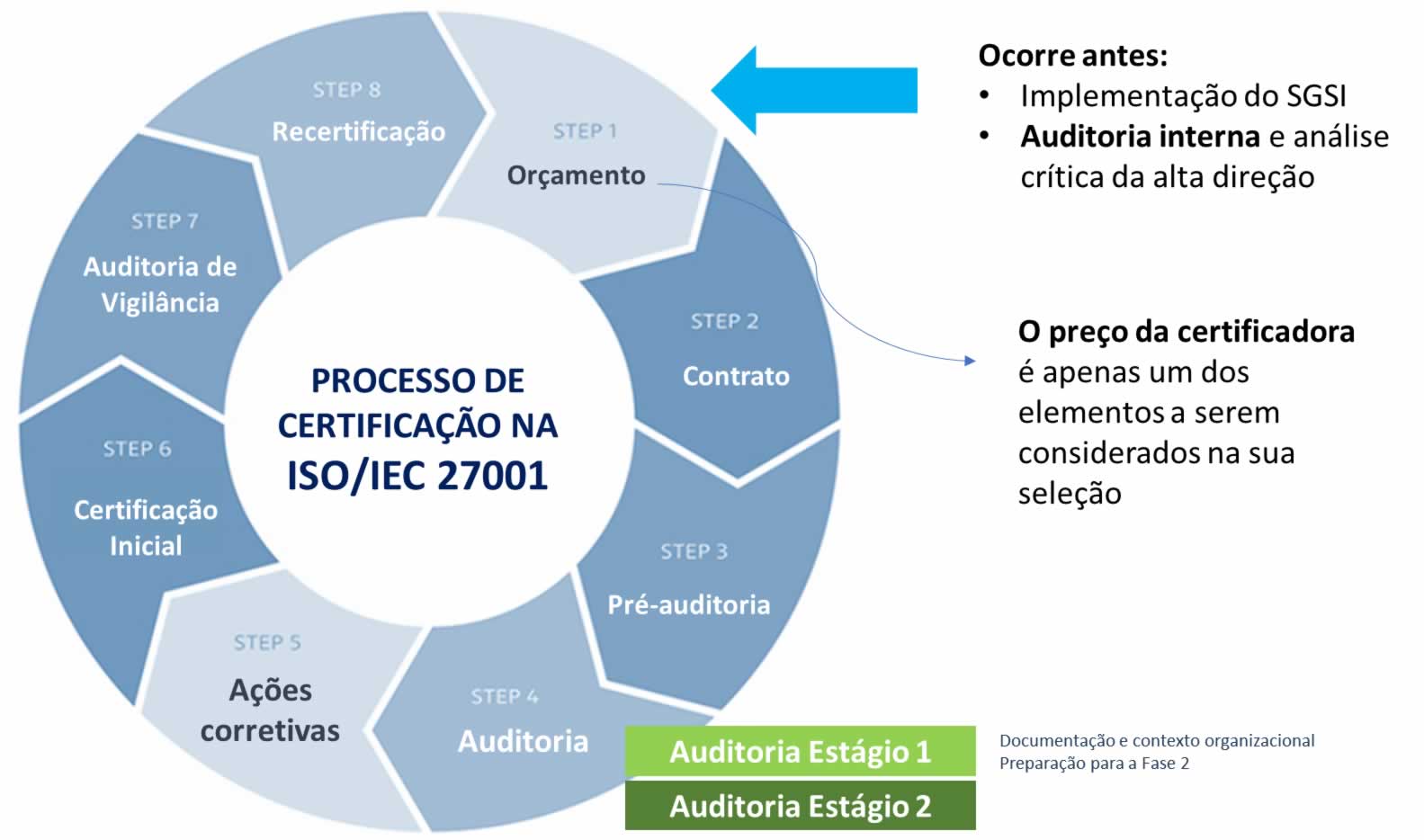 Quando uma organização decide obter a certificação ISO/IEC 27001 — a norma internacional para segurança da informação —, ela contrata um Organismo de Certificação (OC): uma empresa credenciada e independente que audita o seu Sistema de Gestão da Segurança da Informação (SGSI) e, se tudo estiver em ordem, emite o certificado. Esse processo de certificação ocorre em duas etapas: a Estágio 1, em que o OC analisa a documentação do SGSI para verificar se está adequada; e a Estágio 2, em que o OC vai a campo verificar se o sistema está efetivamente implementado e funcionando. Somente após a Estágio 2 — e a resolução de eventuais não conformidades — o certificado é emitido.